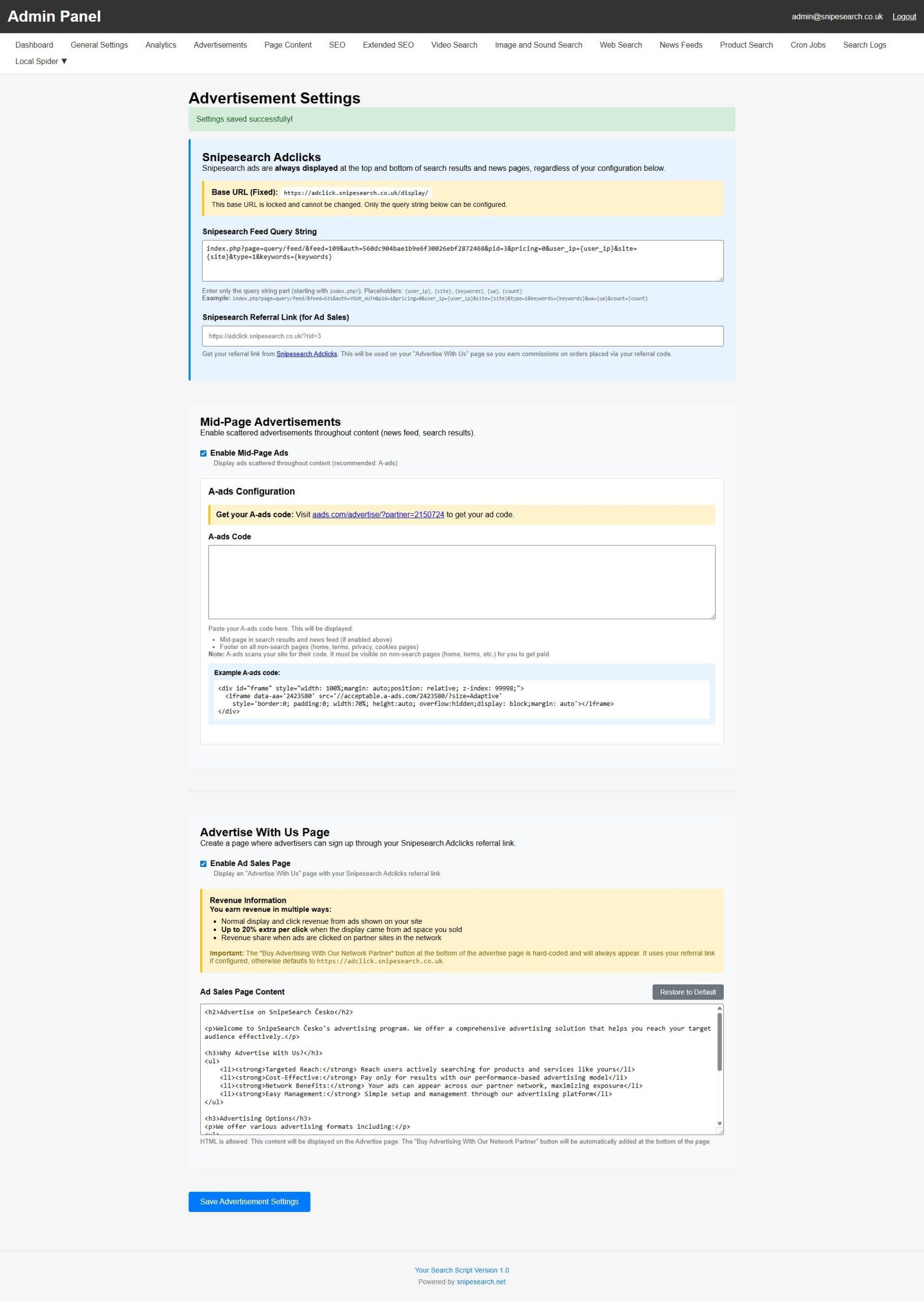 The Advertisements tab in the Admin Panel serves as your platform’s primary revenue command center, providing the essential tools to manage and activate multiple pre-approved income streams. From this centralized interface, you can configure the core Snipesearch Adclicks feed, deploy the A-ads network for mid-page monetization, and customize your public-facing Ad Sales Page to recruit direct advertisers. By mastering this tab, you transform your search engine from a simple utility into a fully automated, high-yield advertising resale asset.