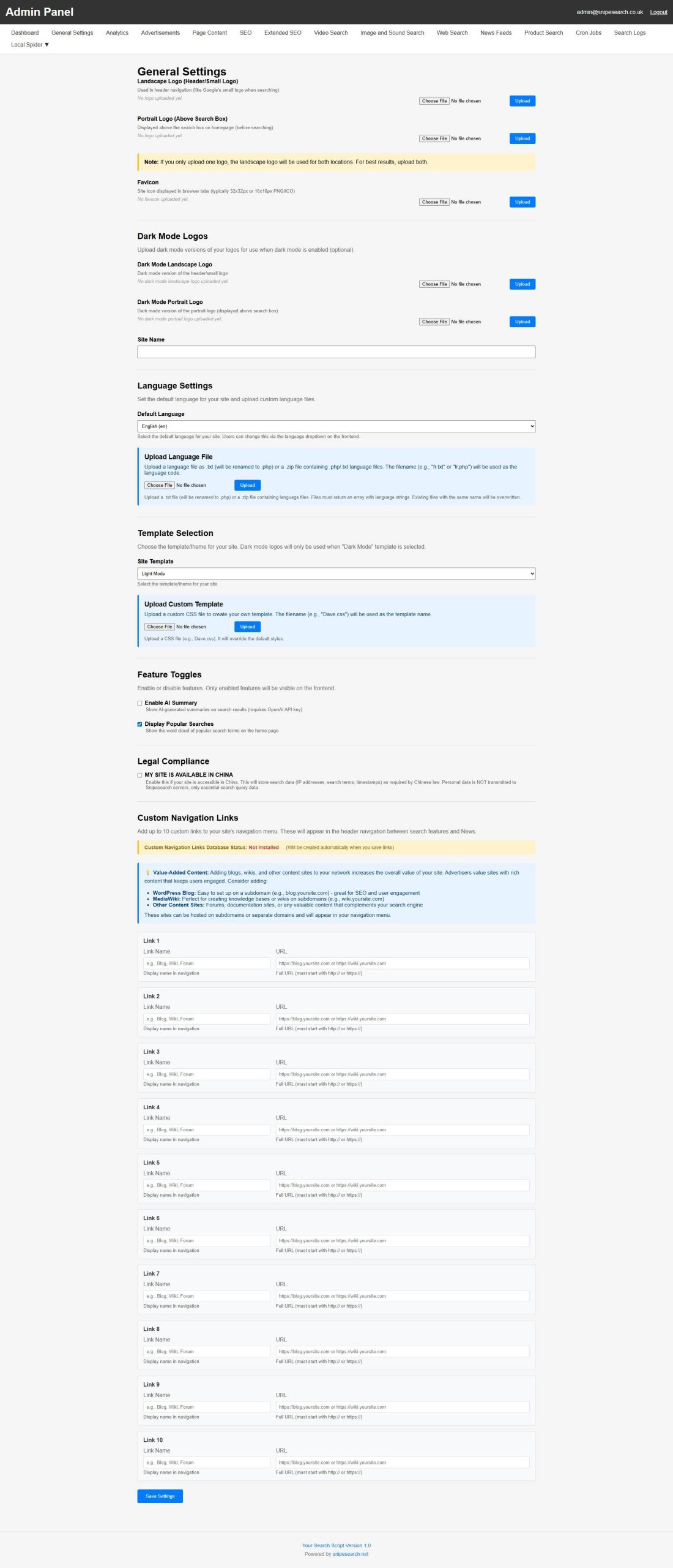 This guide provides a comprehensive overview of the General Settings tab within the Admin Panel. This section serves as the primary control center for the search engine, allowing you to manage everything from visual branding to advanced AI logic and international legal compliance.