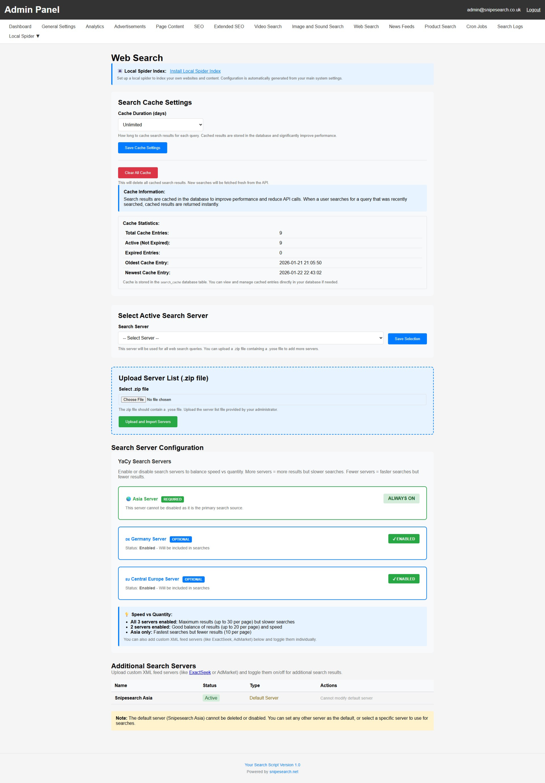The Web Search tab in the Admin Panel is the technical engine of your search platform, allowing you to manage the primary “Surgical Indexing” servers and fine-tune the database caching that makes your engine faster and more cost-effective with every use.